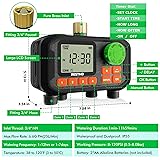 【To Keep Zone 1/2/3/4 Turned Off】Rotate the dial to “HOW LONG”, then use the “+” or “–” buttons to set the watering duration. Press the “Zone” button to switch between zones. For any zone you wish to keep off, set its watering duration to 0 minutes. That zone will remain inactive. 【4 Independent Zones with Easy Operation】Features 4 separate outlets, each acting like an independent timer to water up to four zones from one faucet. Separate oversized dial and buttons make programming simple and intuitive—even with gloves on. 【Separate Zone Buttons】Unlike with cramped, combined zone buttons, our timer features clearly separated and oversized buttons. This thoughtful layout prevents mispresses and ensures quick, intuitive operation—even with wet hands or gloves. 【Flexible Scheduling & Manual Mode】Customize watering with durations from 1–719 minutes and frequencies from every 1–12 hours or 1–7 days. Manual watering starts with a press of the “Manual” button, and rain delay (24/48/72 hrs) is set by long-pressing the “–” button. 【Large Display & Intuitive Setup】The large, easy-to-read LCD screen displays next watering time, current time, and battery status at a glance. Just rotate the dial to set clock, start time, duration, and frequency—no tools or app required. 【Upgraded Waterproof & Durability】Crafted with a seamless embedded screen for leak-proof performance and a rugged textured panel that resists wear and tear. Built with IP55 waterproof housing and leakproof connectors, perfect for lawn sprinklers, garden hoses, greenhouse misting, pool fill-ups, rain barrels, and pet watering setups. 【Worry-Free Support & Warranty】Worry-free after-sales service is provided, including an up to 5-year warranty, expert customer service, and local technical support, ensuring any issues are resolved promptly for complete peace of mind. 【Universal Compatibility & Long Battery Life】Fits standard 3/4” hose and faucet, working with water pressures from 8–120 psi. Powered by 2*AA batteries (not included), it runs over a year with normal use.
