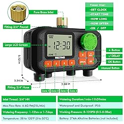 - RESTMO Sprinkler Timer, Programmable Water Timer for Garden Hose, Automatic Digital Control | Manual ON/Off | Rain Delay, 4 OutFEATURES:- 4 Zone Sprinkler Timer- Pure Brass Swivel Inlet - Multiple Mode: Auto / Manual / Rain Delay - Large LCD Screen & Display- Easy to Read & Set Up - Fits into Standard 3/4” Garden Hose & FaucetSPECIFICATIONS: Inlet/Outlet Thread ………………………………………………… 3/4” GHTWatering Duration ………………………………………………..… 1min to 11hrs 59mins Watering Frequency ……………………………………………...… 1-12hrs or 1-7daysRain Delay Time …………………………………………………….. 24/48/72 hoursWorking Pressure ………………………………………………….. 8-120 PSI (0.5-8Bar) Max. Flow Rate …………………………………………………….. 6.6GPM (25LPM) Waterproof …………………………………………………………...IP55 Battery ……………………………………………………………….. 2*AA Alkaline Batteries (not included) Battery Life ………………………….………………………………. Approx. 1 Year WARRANTY:100% satisfaction guarantee45-day money-back guarantee18-month worry-free replacement service let