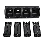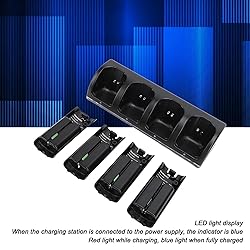 4 in 1 Charging Station: Charge 4 for remote controllers simultaneously without removing the batteries. The USB port charging cable allows easy connection to power source. High Capacity Batteries: Includes 4 2800mAh rechargeable battery packs specifically designed for remotes. Longer battery life compared to standard AA batteries. Easy and Convenient: Fashionable design that matches for gaming console perfectly. Placing the remote controllers in the charging dock is a great way to store for batteries. LED Indicator Lights: LED lights display battery charging status. Blue light when charging station is connected to power source. Red light while charging, blue light when fully charged. Practical and : Charging station is equipped with a 4.9 feet USB cable, which is long enough to flexibly locate the charging station. In addition, an adapter is provided to easily connect the charging station to a standard wall socket or USB port.
