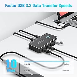 - RSHTECH 2-in-4-Out USB C 3.2 Switch, Simplify cable clutter and boost productivity with effortless switching between two computers, keeping your workspace organized and efficient. Compatible Devices This USB switcher hub works seamlessly with USB 3.2 devices, including external hard drives, high-resolution webcams, cameras, security cameras, printers, scanners, mice, keyboards, and more. Compatible Systems Windows 11/10/8/8.1/7/Vista/XP, macOS 9/10 and later, Linux. Key Features USB 3.2 Gen 2 SuperSpeed: Delivers blazing-fast 10Gbps transfer speeds (20x faster than USB 2.0). Hybrid 2-in-1 Host Connectors: Compatible with laptops, desktops, and gaming systems via USB-A, USB-C, or Thunderbolt ports. Dual-Switch Modes: Toggle devices between two computers instantly using the button or wired remote controller. Dual-Color LED Status Indicators: Red: PC1 active | Blue: PC2 active Easy Setup: Plug-and-play operation – No drivers required. Bus-powered design with an optional 5V USB-C power input for stable performance with high-demand devices. Simply connect a standard phone/tablet USB-C charger (sold separately). Specifications Model: RSH-A201C Color: Black USB Data Ports: 2× USB-A + 2× USB-C 3.2 Gen 2 Power Input: DC 5V Type-C Materials: Aluminum + ABS Cables Included: 3.3 ft (1 m) USB-C to USB-A/USB-C host cable 4 ft (1.2 m) wired remote controller
