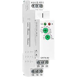 - Time Relay Delay Turn Off 10A Adjustable Smart Relay Electronic Timer in Din Rail, 0.1s-10 Days Wide Range Delay Factory Automation Time Universal Voltage GRT6 AC DC 24-240V (GRT6-B2-240)Delay Off Time Relay Electronic 10A AC24V with CE Certificate Delay Single Function Time Relay 2 Output 10A Electronic Adjustable Power ON Timer Delay Relay Rail ModularDelay OFF Time Relay Electronic 10A 1SPDT Adjustable Timer Delay Relay Din Rail Modular with CE CB CertificateGRT6-B1 Delay Timer Switch, AC DC 24-2400V Mini Power OFF Delay Time Relay DIN Rail 35mm Cycle Delay Timer Relay Switch for Industrial ControlDelay OFF Timer Relay 1 Output 10A Electronic Power DFF Timer Delay Relay Din RailGRT6-B Electronic 10A SPDT OFF Delay Timer Relay Time Relay AC230V DIN Rail Delay OFF Relay 24VFUNCTION& APPLICATION: 24v timer relay, preset the machine to work for a predetermined time and then turn off the time. It has a wide delay setting range of 0.1 seconds to 10 days, a wide working voltage of AC230v (50-60Hz), output contact: 2SPDT (2NO 2NC), rated current is 10A. This ac240V timer delay relay can be used in industrial equipment, lighting, manufacturing industries to accurately control the delay time of changing lighting, heating, motors, machines, etcINDICATOR BUTTON: The working status of the delay relay is indicated by the LED indicator: the green LED indicator is always on (power on), the green LED indicator is off (power abnormality); the red LED indicator is on (indicating the start of work), the red LED indicator is off (indicating the stop of work). If you want to set the device to shut down after working for 5 days, please adjust the first knob of this delay relay to 10 days and the second knob to 50%. Then the terminal will disconnect the circuit and stop working after working for 5 daysCOMPACT AND EASY TO INSTALL: Din rail ac24V delay timer relay is 2.66 inches x 3.66 inches x 0.9 inches, installed on a 35mm din rail, easy to install, portable and compactCHOICE MATERIALS: GRT6 Series delay on time relay made of industrial grade plastic , compliant with UL, CE, CB, RoHS standards, flame retardant, relay switch has a sealing ring that can isolate dust and oxygen, and can work stably in humid environments to protect your expensive equipmentWORRY FREE AFTER-SALES SERVICE: we provides a 30 day no reason return and a 3-year warranty for this product. If you have any questions about installation or use, or if you encounter any problems during use, please feel free to reach up to us at any timeDelay Off Time Relay GRT6-B2 Delay Timer Switch And Relay Module,Time Delay Off Relay 10A Electronic Adjustable Timer Relay Din RailFunction:Relay Control Module Sets The Delay Directly Through The Panel Knob, and The Time Delay Relay to Work.Circuit Structure: Single-Function Delay Time Relay, Time Relay Supports A Broad Time Scale from 0.1s to 10 Days and Suitable for Industrial Equipment, Output Contact: 1SPDT(1NO1NC),Delay Control Switch.High Precision: Time Delay Relays Are Suitable for Applications Requiring Precise Timing and Control, RoHS Compliant.LED Indicator Shows The Working Status of The Relay for Easy Monitoring.Mini Size:Time Delay Relay, While Only 16mm Width, 35mm Din Rail Mount. 1-MODULE, DIN rail mounting.relay24v relayinterval timerdelaysmart relaytime delay relaytimer relayrelay moduledelay timer relaydelay time relaydin rail