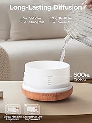 Premium 10-Piece Essential Oil Set - Ten 10ml bottles of 100% pure natural oils (peppermint, orange, lavender, tea tree, rosemary, eucalyptus, lemongrass, lemon, clove, vanilla) for use with diffusers. Creates subtle, lasting fragrance in any space. Ideal for home, office, or spa use. Elegantly packaged, perfect for gifting. Extended 16.5ft Remote Control Reach: Control the Prime essential oil diffuser effortlessly from up to 16.5ft away with the included remote, letting you fine-tune mist and light settings without leaving your comfortable bed or sofa. Prolonged Aromatherapy and Humidification: With a capacious 500ml and easy-to-clean water tank, the InnoGear oil diffuser can run for up to 18 hours (9-12h for strong mist and 16-18h for weak) without the need for mid-session refills, to elevate your sensory experience from the moment you wake for the day to the last few minutes before you drift off to sleep at night. Multiple Mist Modes: The aromatherapy diffuser is selectable to run in continuous or intermittent mode (releases mist every 10 seconds), strong or weak mode, and is adjustable with the humidifier timers (1H/2H/3H) to suit your preferences and create the perfect ambiance. Powerful Upwards Mist Flow: Thanks to advanced ultrasonic technology, the diffuser delivers a potent upward mist flow—three times stronger than ordinary diffusers. Efficiently humidify the air without affecting your furniture, ensuring uniform atomization of essential oils