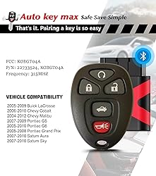 COMPATIBILITY: Designed for Chevy Malibu 2004 2- 2012 Cobalt Pontiac G5 G6 Grand Prix Buick Lacrosse Saturn Aura Sky.FCCID: KOBGT04A 22733524 PROGRAMMING KIT: Complete set includes necessary tools and detailed instructions for pair your replacement key fob DIY SOLUTION: User-friendly pair process allows for quick and convenient key fob setup at home.If you have any questions, please contact me FUNCTIONALITY: Supports all standard remote features including lock, unlock, panic button, and trunk release operations SPECIFICATIONS: Operates on standard CR2032 battery (not included) with typical signal range of up to 30 feet