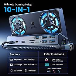 10-in-1 Handheld Console Dock:Transforms your Steam Deck OLED/ASUS ROG ALLY/ Legion Go's USB Type-C into 10 ports: 4K@60Hz, Gigabit Ethernet (1000Mbps),3 USB3.0 (5Gbps), 3 USB2.0, USB Type C PD 3.0 (100W),VGA,DP1.2 port,this docking station will meet your all need when you playing games. Dual Cooling RGB Fans: Good heat dissipation not only extends the battery life of the steam deck, but also prevents other problems caused by overheat,increase the speed of cooling air entering steam deck so that heat dissipates faster.Say goodbye to the woes of system crashes or lost frames, and embrace a consistently smooth gaming experience. 4K@60Hz Output: This Gamer Docking station comes with a 4K@60Hz ,When you connect an external 4K monitor, it can provide you sharper and smoother visual experience, so you can enjoy the visual feast on your games. to achieve higher resolutions, simply navigate to game settings > properties > general > game resolution. however, please ensure that both the hdmi ports and cables used are hdmi 2.0 or above. PD3.0 100W USB C Charging: supports 100w max power delivery, which is sufficient to charge your steam deck at full speed when paired with the original charger,Note: max 45W charging speed for the Steam Deck,while ROG Ally reaches 65W.Upgrade your Rog Ally BIOS to version 323 and experience seamless compatibility with the 30W Turbo Mode of your ROG Ally. Unleash the full potential of your gaming device. Stable Gigabit Ethernet & Fast Data Transmission:supports 10/100/1000BASE-T Lan networks,which could elevate your gaming to the next level with blazing-fast gigabit Ethernet, delivery unparalleled download and upload speeds for seamless online multiplayer and reduce the lag of playing games. Also,3 x USB 3. 0 ports(speed up to 5Gbp),3 x USB 2.0 ports allows you transfer files and big huge games in seconds, connect to the gamepad, mouse and keyboard without any lags.