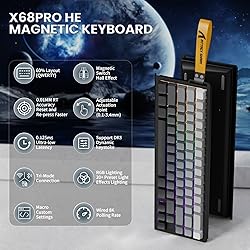 【Esports-Ready Magnetic Switches】The ATTACK SHARK X68 PRO HE gamiing keyboard features Hall Effect amber magnetic switches with 0.01mm trigger accuracy and adjustable actuation from 0.1mm to 3.4mm. Its zero dead zone design ensures instant command execution, perfect for FPS and complex maneuvers, while supporting DKS, MT, and TGL for enhanced control. 【8000Hz Polling Rate & 0.125ms Latency】Equipped with a custom coiled keyboard cable, the X68 PRO HE supports an 8000Hz wired polling rate for ultra-fast input transmission. In wireless mode, it delivers a 1000Hz polling rate, paired with a 128KHz scan rate, reducing latency to an impressive 0.125ms. Experience up to 8x faster response than conventional mechanical gaming keyboards, giving you a decisive competitive edge. 【Seamless Multi-Device Connectivity】This hall effect keyboard with magnetic switches supports tri-mode connectivity—Bluetooth, 2.4GHz wireless, and USB-C wired—for ultimate flexibility. Switch modes effortlessly via the side button or shortcut keys (FN+Q/W/E for Bluetooth, FN+R for 2.4G). Powered by a robust 3000mAh battery, it’s perfect for gaming, work, and study without interruptions. 【Driver Customization & Hot Swappable】The QMK web driver offers easy customization without software downloads, allowing you to adjust key functions, macros, RGB effects, and more, while the hot-swappable PCB lets you switch between different north-pole-down magnetic switches for a fully personalized experience.(download driver from bit.ly/X68HESOFT) 【Compact ANSI Layout & RGB Lighting】With a 60% QWERTY layout and 66 keys, this ultra-compact keyboard frees up valuable desk space while delivering powerful performance. Its south-facing RGB lighting, with 16.8 million color options, creates stunning visual effects to enhance your gaming experience and workspace aesthetics.