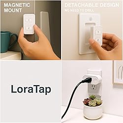 - Take Control Without the Hassle The LoraTap RF Remote Outlet Switch lets you wirelessly control two devices from up to 100 feet away—no Wi-Fi, wiring, or drilling required. Key Features: Dual Device Control: Independently manage lamps, fans, or small appliances with one remote Strong RF Signal: Stable operation through walls and floors—ideal for basements, garages, or rooms with weak Wi-Fi Flexible Placement: Mount the magnetic remote on walls (adhesive plate included), attach to metal surfaces, or use handheld Simple Setup: Pre-paired and battery included—ready to use in seconds Ideal For: Controlling hard-to-reach outlets behind furniture Adding light switches where wiring is impractical Managing devices in rental properties (no permanent changes)