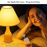 【Plug & Play】 Instant setup—no wiring, drilling, Wi-Fi or Bluetooth. Pre-paired and battery included. Perfect for renters, temporary setups and tech-minimal lifestyles 【Dual Device Control】 Control two lamps (e.g., bedside + floor lamp) from one remote—perfect for bedrooms without ceiling lights. Install the switch by the door and never walk into a dark room again 【Reliable RF Control】 Enjoy stable control up to 100ft—dedicated RF signal avoids Wi-Fi interference, with faster response than smart plugs. Perfect for areas where wireless networks struggle 【Flexible Magnetic Switch】Choose your control style: mount like a traditional wall switch, attach to metal surfaces (like fridges or cabinets), or take it portable—all options deliver instant, whole-home control without wiring hassles 【Transform Your Space】Upgrade any outlet to wireless control—ideal for elderly-friendly bedrooms, child-safe spaces, mobility-accessible areas, and garages/basements without switches