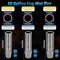 - Thinkpro 10 Spline Lug Nut Key Replacement is a meticulously crafted solution designed to meet the demands of both professional mechanics and DIY enthusiasts. Engineered for the Ta20 17/19,TA20-19/21 TA23-21/22 specifications and seamlessly compatible with Bimecc 10 point lug nut key , this 10 spline lock key is a testament to precision and durability. Forged from high-quality CR-MO steel,this wheel lock 10 spline stands up to the rigors of use with a promise of long-lasting strength and corrosion resistance. 10 Splined Nut Sockets feature a dual drive design to simplify tool changes, allowing you to choose between17mm 19mm 22mm and 21mm hex drives or 3/8’ square drives to suit your existing tools.This feature, coupled with laser-etched size markings, ensures that identification and use are swift and hassle-free. The thoughtful addition of a clear plastic case not only provides organized storage but also enhances portability, making this 10 spline lock socket as convenient as it is robust. However, it is important to note that this lug nut key is specialized for Ta20 17/19,TA20-19/21 TA23-21/22mm and not compatible with all wheel nuts, particularly those with long spikes. Verifying compatibility with your vehicle before purchase is crucial to ensure that you have the right tool for the job. By choosing Thinkpro, you're investing in more than just a tire maintenance tool; you're equipping yourself with a reliable assistant for those unexpected moments when vehicle issues arise. Whether it's a flat tire on a long trip or a routine wheel check, Thinkpro's 10 star lug nut socket is there to provide the support you need to get back on the road swiftly and safely. This isn't merely a purchase; it's a commitment to a worry-free driving experience. Embrace the peace of mind that comes with being prepared for whatever the road may throw at you. Don't delay—elevate your toolkit with Thinkpro's 10 point wheel lock key Replacement and drive with confidence.