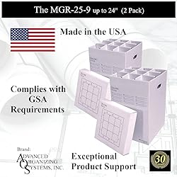 - MGR-25-9-2pkg (for additional per unit savings) -- Stores Rolled Items Up to 24” In Length. By Advanced Organizing Systems, Inc. The economical solution for organizing plans, maps graphics and all other rolled items in office/home or permanent storage. Ideal to manage documents from 11”x17” to 24”x36”. Durable with exceptional stacking strength. Attractive corrugated cardboard with reinforced bottom. Gray lettering on white background. Side handles with identification labels on interior and exterior. 9 compartments @ 5.25”x5.25”. 2 files per pack. Overall size is 17.5”x17.5”x25” each. MADE IN USA, USA Customer Support