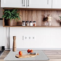 【Package Includes】:You will receive 2 pack large size highly absorbent dish drainer mats in the package.Placemats have a lanyard on the side for hanging to dry. 【Product Size】:Microfiber dish drying mat measures 24 x 17in/61 x 43cm,oversized to hold more pots and pans,plates and other utensils.Placemats can be flipped over at will for easy use. 【Premium Materials】:Kitchen counter quick dry pads are made of three layers of material,thick and absorbent,no need to worry about damage to expensive tableware and marble countertops. 【Easy to Storage & Clean】:Highly absorbent dish drainer mats can be folded up and thrown in a drawer when not in use.Simply wash with cold water,no machine or hot water is recommended. 【Widely Used】:Microfiber dish drying mats can be used on countertops in the kitchen,living room,bathroom,office and more.Use for dish draining,coffee maker mats,sink mats and more!