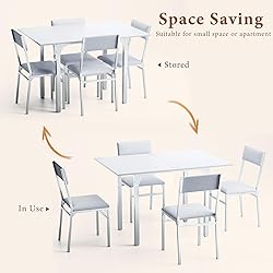 5-Piece Dining Table Set: This set comfortably seats 2-4 guests, which includes a foldable dining table, and 4 chairs. The white woodgrain tabletop style and the white frame's clean lines make dining table a versatile addition to the kitchen, dormitory, living room, study room, office and meeting room. Extendable Dining Table for Flexible Space: The kitchen table can be rotated and flipped to extend when you need the extra space. When not in use, gently push the stool into the area under the dining table, giving you more room to move around. Upgraded Upholstered Chairs: The kitchen table chairs set of 4 features soft fabric upholstered seats that exude comfort and elegance, creating a welcoming and inviting seating experience for the modern dining table. Sturdy & Durable: High-quality MDF board is used in this white dining table set, which is waterproof and scratch-resistant; it can be easily cleaned with a sponge and water. The sturdy steel frame and triangular triangular structure provide strong support and stability for the dining table set for 4. Functional & Easy Assembly: You can use kitchen table chairs set of 4 as an addition to your patio dining table, computer desk, study desk, office desk and breakfast nook. Easy assembly with detailed installation manual and organized packaging.