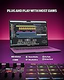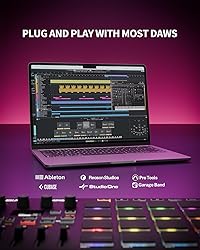 RGB Drum Pad — 16 velocity sensitive silicone drum pads with individually adjustable RGB lighting (4 banks x 16 pads = 64 assignable zones) let you create vibrant, color-coded performances. Perfect for matching moods, genres, or live stage aesthetics with instant visual flair Wireless and Powered Portability — Seamlessly connect to any DAW via Bluetooth 5.0—no drivers needed! Powered by just 2 AA batteries (not included), the EMP16 offers hassle-free wireless performance for mobile music creation, live shows, or studio sessions on the go 4 Velocity Curves — Normal, Soft, Heavy and Fixed, adjust crosstalk protection thresholds, and customize sensitivity with 16-level, full-level/half-level, or aftertouch modes. Designed for expressive drumming and fingertip accuracy, even during intense sessions Real-Time Performance — Enhance creativity with 12 assignable controls (4 faders, 5 buttons, 4 endless rotary knobs) across 3 banks. Built-in tools like Note Repeat, Swing, Gate, Sequencer, Tap Tempo, and Transport controls deliver studio-to-stage versatility for immersive, hands-on music production Universal Connectivity — See every setting and playing params instantly with the bright OLED screen. USB MIDI, 1/8" MIDI I/O, and included adapter cable ensure seamless integration with laptops, hardware synths, or stage gear—plug in via USB or use the included 1/8"-to-MIDI adapter for instant setup