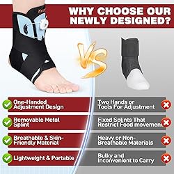 Adjustable Knob for Custom Fit & Support - This ankle brace features an adjustable knob for easy compression control. Unlike a lace-up ankle brace, it provides a secure, customized fit, ensuring maximum stability for recovery and daily activities. Removable Metal Splints for Protection - The ankle brace for sprained ankles includes detachable metal splints for extra stability. Customize your support level based on injury severity, offering flexibility and firm protection for recovery and prevention. Breathable & Lightweight for Comfort - Made from breathable fabric, this ankle brace for women and men keeps feet cool and dry. The lightweight design ensures long-lasting comfort, size S(fit Men US 5-7, Women US 5-8.5, EU 34-40), size M(fit Men US 7-12, Women US 8.5-12, EU 40-46). Pain Reliefs for Sprains & Tendonitis - These ankle braces for men help relieve pain from sprains, swelling, and Achilles tendonitis. It reduces discomfort, promotes faster healing, and offers excellent support for recovery and injury prevention. Ideal for Sports & Daily Use - Whether for running, sports, or daily wear, this lace-up ankle brace provides stability and protection. Designed for active lifestyles, it ensures comfort and security for injury recovery and prevention.