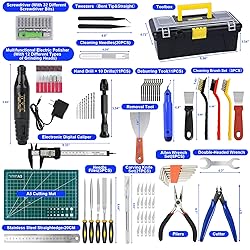 𝟏𝟑𝟓𝐏𝐂𝐒 𝟑𝐃 𝐏rinter 𝐓ools & 𝐀ccessories 𝐊it:This 3D printing accessory set contains all the essential 3D printing tools. Includes: Needle-nose pliers x1, tweezers x2, electric hand drill x11, electronic pliers x1, electric screwdriver x32, ruler x1, electric grinding head x13, cleaning needle x20, cleaning brush x5, A5 cutting board x1, file x5, trimming knife x11, shovel x1, hexagon wrench x8, double-ended wrench x1, carving knife x21, caliper x1, toolbox x1 𝐇igh 𝐐uality 𝐌aterials:Our needle files,A5 cutting mat,file,stainless steel ruler,and carving knife sets are made of durable and long-lasting materials and offer precision and accuracy. The hand drill is perfect for drilling holes in assemblies or upgrades. We've increased the variety of carving knives, and the blade is sharper and less prone to rust. This 3D printer accessory tool set meets various printing needs. to meet your needs and ensure a smooth printing process 𝟑𝐃 𝐏rinter 𝐍ozzle 𝐂leaning 𝐊it:Includes 3 cleaning brushes, 2 scoops, 2 tweezers of different sizes, and 20 cleaning needles for cleaning needles and debris from your 3D printer's nozzles and other hard-to-reach areas. You can clean the nozzle without disassembling the hotend, saving you a lot of time 𝐌odel 𝐄diting 𝐓ools & 𝐑emoval and 𝐈nstallation 𝐓ools:We have prepared needle files, deburring tools, and carving tool sets for you to finely edit the model and make your printed products more exquisite. Plastic and metal spatulas help you remove the model from the print platform. When the prints are complete, the removal tool helps you remove the prints. Cutters and pliers can handle print details and remove excess materials, burrs, and prints 𝐀ll-in-𝐎ne 𝟑𝐃 𝐏rinting 𝐀ccessories 𝐊it: An essential 3D printer tool for any workbench. This 136-piece complete 3D printer accessory set contains a wide range of high-quality tools and accessories for 3D printing enthusiasts. Our 3D printer tool kit comes with a special storage case, lightweight and portable, making it convenient for users to store and use at home or on the go, ensuring that the tools are not easily lost and can be kept neatly organized 𝐌ultifunctional 𝐔se: This tool set is suitable for all types of 3D printers, helping users disassemble, clean, and maintain their printed models, ensuring print quality and extending the life of the device. It is an ideal birthday gift for 3D printing enthusiasts, creatives, and tech lovers