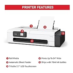 Quality Prints: The 4-color ink printer delivers crisp text and vibrant images for attention grabbing posters on a wide variety of cut sheet and roll media. Ships with a full set of ink: The imagePROGRAF TC-21 ships with 280 ml (70 ml of each color), the most in its class. 24" desktop roll printer with automatic sheet feeder: The imagePROGRAF TC-21 can print up to 24" wide on a variety of roll media or sheet media from the automatic sheet feeder. Easy Setup and Maintenance: imagePROGRAF TC-21 printers have an intuitive tiltable touchscreen control panel and animated installation guides to provide quick-and-easy setup - Top and front interior access makes it easier to refill ink tanks, replace paper rolls, and perform maintenance. Wired and Wireless Productivity: High-speed USB and Ethernet connectivity lets you connect to your network for fast, reliable printing - Print wirelessly from your computer, smartphone, or tablet with built-in Wi-Fi for even greater efficiency; TC-21 printers are ENERGY STAR and EPEAT Gold rated.