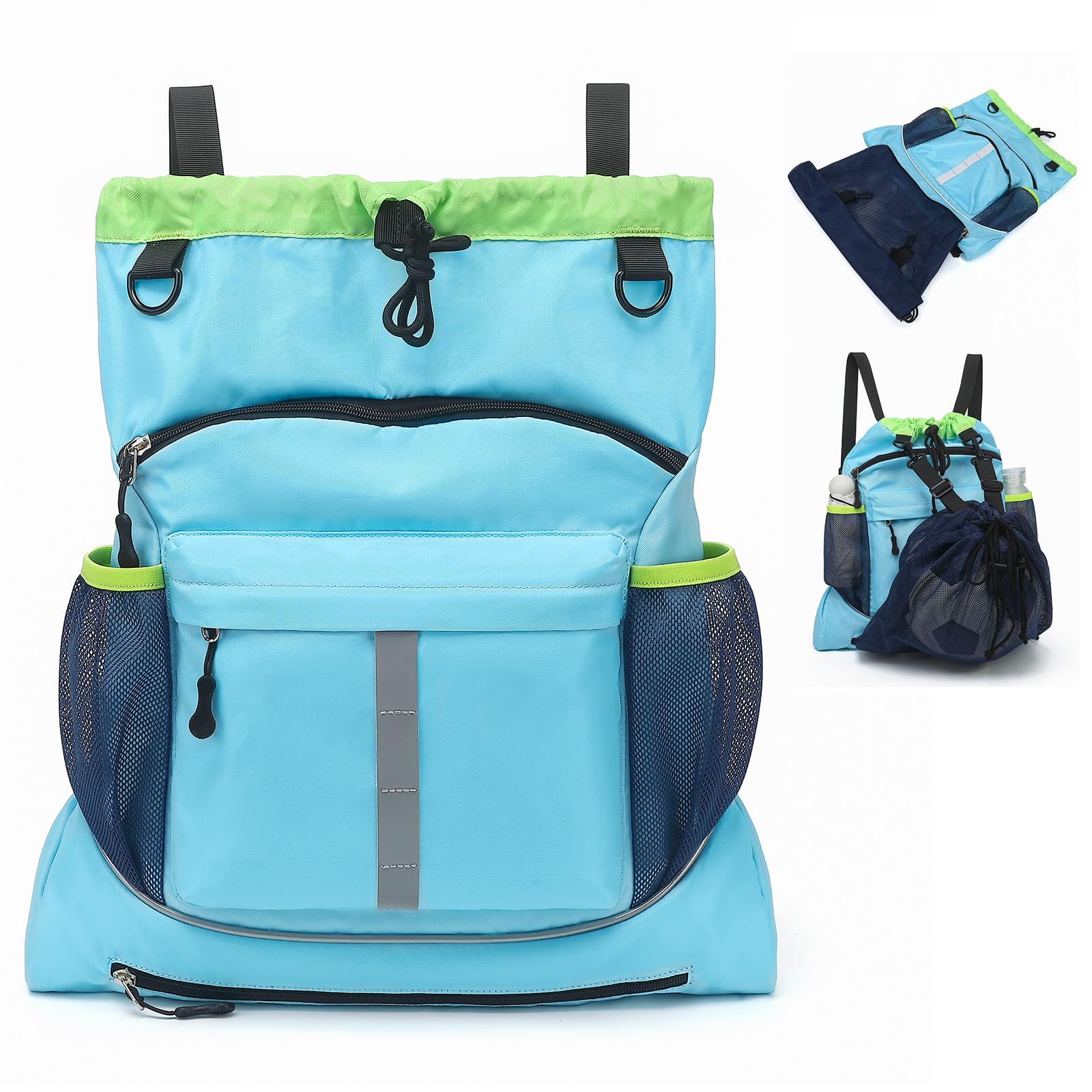 Drawstring Backpack, Waterproof Sandproof Beach Backpack for Sport Gear Small Gym Bag with Hidden Ball Net Pocket and Seperated Wet Pocket Draw String Back Bag for Women Men, Blue