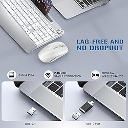FULL SIZE KEYBOARD WITH PHONE HOLDER: JOYACCESS wireless keyboard is compact without giving up too much in the way of functionality since the full size keyboard has all the keys you need. Even when concentrated on work with office computer, you'll never miss any messages from your phone with this white keyboard, since the built-in cradle can prop up your smartphone horizontally or vertically at a perfect angle to read or watch videos. WIRELESS ERGONOMIC KEYBOARD WITH WRIST SUPPORT: The wireless keyboard is equipped with a generous palm rest and tilt legs, which helps to position your wrist and forearm in a more natural, relaxed posture. Cordless mouse provides whisper-quiet clicking, never worry about disturbing others to rest while working or playing. Specially designed volume knob to help you adjust faster. 2.4Ghz WRELESS CONNECTION:Stable and reliable connection of wireless keyboard and mouse is up to 10m(33ft). This combo share a nano USB receiver, no need to take upadditional USB ports (Also the wireless keyboard and mouse can also be used separately). Plug and play, no software needed,convenient and efficient. WINDOWS AND MAC LAYOUT: Enjoy the familiar typing whether you're apple fans or a PC user. Available for both PCs and Macs (complete with the right Command and Option keys position), you can use Windows or Mac keyboard layouts depending on your devices system with this hite keyboard and mouse. Activate Mac Layout: Press Fn+S key; Activate Windows Layout: Press Fn+S key. LONG BATTERY LIFE: The ergonomic wireless keyboard is powered by 2 AAA battery, and the wireless mouse is powered by 1 AA batteries (batteries are not included). Both mouse and keyboard have an on/off switch, turn them off when not use, to save battery life and reduce battery replacement. Wireless keyboard and mouse have a smart auto-sleep mode to save power. They will enter sleep mode after stop using a while(Refer to the instructions for details).