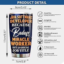 【Celebrate Your Java Software Developer】: Surprise your favorite Java Software Developer with this 20oz tumbler, designed for the master of messaging – perfect for work, office appreciation, retirement, birthdays, or Christmas celebrations! 【Premium Stainless Stell Design】: Crafted from durable, rust-resistant stainless steel, this insulated tumbler keeps coffee hot for 6+ hours or water cold for 12+ hours – ideal for busy professionals on the go. 【Perfect Size For Every Day】: With a 20oz capacity, this sleek travel mug fits most car cup holders and delivers all-day hydration – a must-have coffee cup for men and women in the fast-paced world of communications. 【Spillproof lid】: Our insulated coffee tumbler includes a premium spill proof lid that keeps your drinks where they belong - in your cup! The slider design can be used with or without a straw and is easy to sip while you are on the go. 【Thoughtful Gift Ready】: Show your gratitude with this stylish tumbler, an excellent choice for coworkers, bosses, or friends – no wrapping needed, just pair it with their favorite brew for a memorable present!