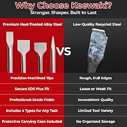 - Power Through Demolition with the Keewaki SDS Plus Chisel Set The Keewaki 4-piece SDS Plus Chisel Set is designed for serious demolition, renovation, and tile removal work. Crafted from heat-treated, high-strength alloy steel, these chisels deliver long-lasting durability and resist bending, wear, and deformation—even under heavy impact. This set includes four essential chisel types to tackle a wide range of tasks: Flat Chisel (10" x 0.8") – ideal for general-purpose chiseling and leveling Wide Flat Chisel (10" x 1.6") – great for surface scaling and mortar removal Pointed Chisel (10") – concentrates force for cracking and breaking concrete Bent Tile Chisel (10" x 1.6", 10° bend) – optimized for tile and thinset removal Compatible with all standard SDS Plus rotary hammer drills, this set ensures a secure fit and efficient energy transfer for enhanced control and reduced fatigue. Whether you're breaking up concrete, removing ceramic tiles, or scraping away old flooring, Keewaki chisels get the job done faster and cleaner. Backed by over 20 years of toolmaking experience, Keewaki delivers professional-grade tools trusted by contractors and DIYers alike. Comes complete with a sturdy storage case to keep your chisels organized and protected.