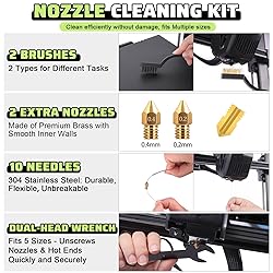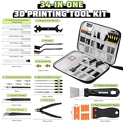 【3D Printer Tools Expedite Your Workflow, 1-Year Warranty】Designed and Selected by a 15-Year 3D print enthusiasts team, this kit includes all essential tools. We have MK8 Brass Nozzles x 2, Nozzles Cleaning Needles × 5, Brushes × 2, Small Multifunctional Wrench x 1, 45# Steel Removal Scraper x 1, Razor Spatula x 1 plus Blades x 11, Files x 5, Engraving Knife x 1 plus Blades x 6, Tweezers x 2, Wire Cutter x 1, ensuring a successful 3D model-building experience. Pro tools, better price. 【Nozzle Cleaning & Replacing One-Station Solution】To avoid filament inconsistent extrusion caused by a clogged nozzle, we prepare 5 different types of cleaning needles, (0.2mm, 0.25mm, 0.3mm, 0.35mm, 0.4mm). Moreover, 2 EXTRA Premium 3D Printer MK8 Brass Nozzles (0.2mm, 0.4mm) suitable for most 1.75mm PLA/ABS filament 3D printers. In addition, 2 types Metal and Nylon cleaning brushes, tweezers are added for precision cleaning. 【2 Types of Removal Scrapers for Flawless Prints】To remove different-sized prints without damaging the print bed, the kit includes 2 types of removal scrapers. One scraper features a Heavy Duty Stainless Steel Blade for maximum leverage and fast removal, perfect for medium to large models like 3D printed dragons, ideal for PETG, ABS, PLA+. The smaller scraper with 10 extra-thin flat blades offers pinpoint accuracy, making it perfect for removing small models with precision like 3D printed toys. 【5 Shapes of Metal Files Catered to A Wide Range of Tasks】They are flat steel file, flat warding steel file, square steel file, triangular steel file, round steel file, and half-round steel file, for 3D objects Polishing and Processing such as filing, deburring, shaping, and smoothing etc. Worth mentioning, our metal files are made from high-hardness carbon steel and feature ergonomic handles for extended use. 【3D Printer Accessories Gift Must-Have】Black canvas storage bag with tool holder for easy finding, organizing, storing and transporting. The storage box provides ultimate protection to keep all 3D printer tools in good condition from dust, debris and moisture, ensuring all tools stay sharp and in good condition, ready for your next 3D printing task. Your Satisfaction, Our Commitment: All products are covered by a 1-year warranty, and all questions will be answered within 12 hours.