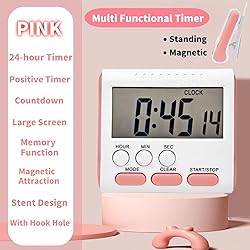 **Large and Clear Display**: The 24 hour digital timer features an easy-to-read 2.5 x 1.2 inch LCD screen with large numbers, making it ideal for anyone who needs a quick glance at the time during cooking or other tasks **Loud and Reliable Alarm**: Equipped with a powerful alarm that lasts up to 60 seconds, this timer ensures you won't miss an alert, perfect for use as a kitchen timer or small alarm for any cooking needs **Versatile Functionality**: This multi-functional timer can serve as both a countdown timer and an alarm clock, with storage memory for advanced timing needs, enabling quick adjustments for 24-hour increments **Stable and Secure Settings**: Designed to prevent accidental modifications, the digital settings of this timer remain unchanged for 10 seconds when in clock mode, ensuring reliable operation in any environment, like your kitchen or stove area **Ideal Design for Flexibility**: Available in multiple colors, this 24 hour digital timer includes convenient features such as a magnet, hook, and stand on the back, allowing for versatile placement on fridges or countertops