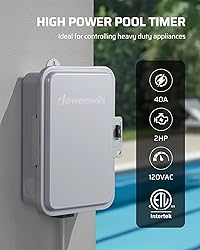 - The DEWENWILS Heavy Duty Pool Timer is your reliable solution for automating pool and spa equipment. Designed for power and performance, this 40A outdoor timer handles up to 2HP at 120V or 5HP at 240V, making it ideal for pool pumps, water heaters, fountains, and more. With a 24-hour programmable on/off switch, you can set it once and let it run your schedule effortlessly. The weatherproof and tamper-resistant housing ensures safe operation in any outdoor environment, while the ETL & UL listings give you peace of mind. Simplify your pool care with powerful, worry-free automation! Specifications: Switch: SPST Input: 120VAC 60Hz Output:40A Resistive, 120VAC 2HP, 120VAC Packing List - Timer Box x1 - Instruction Manual x1