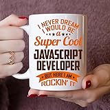 - Looking for the perfect gift for a Javascript Developer? I Never Dreamed I Would Be A Cool Javascript Developer But Here I Am Rockin It mug is a fun and functional choice! Whether you're buying for a seasoned professional, an aspiring student, or a hardworking coworker, this mug is a fantastic way to celebrate their skills.Crafted from durable white ceramic, this 11oz mug is microwave and dishwasher safe, ensuring easy use and care. The bold, humorous design is printed on both sides, making it an eye-catching piece at home, in the office, or on a job site. The comfortable C-shaped handle ensures a secure grip, while the bold printed quote adds a touch of personality to your daily routine. With a capacity of 11 ounces, it’s the ideal size for your morning coffee, afternoon tea, or any drink of choice.Perfect for birthdays, Christmas, graduation gifts, or just because, this civil engineer coffee mug is sure to bring a smile to any Javascript Developer’s face. Whether they’re sipping on coffee, tea, or hot chocolate, this mug is the ultimate Javascript Developer!