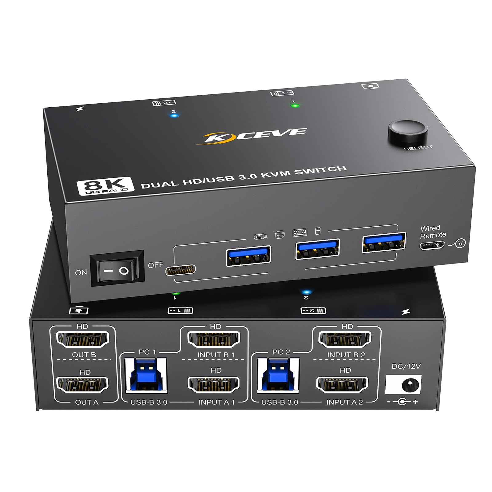 - 【USB C HDMI DP KVM Switch 2 Monitors 2 Computers】KCEVE KVM Switch Dual Monitor HDMI allows you to use 1 set of mouse, keyboard to control 1 laptop and 1 desktop computer, compatible U-disk, scanner, printer, webcam, each computer is displayed on 2 HDMI monitors. You can press "Windows+P" to select mirror mode, extended screen mode, or splicing wall mode. KVM Switch 2 Computers 2 Monitors is the first choice for offices, business seminars, home theater, multimedia teaching, game video.