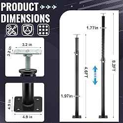 Enough to Use: you will receive 2 pieces of floor jacks for house, coming in black color, giving you more versatility for your projects, stable and sturdy, ideal for using in renovation projects as temporary or additional support Adjustable Height Range: with an adjustable height ranging from 4.6-8.2 ft (55.12-98.43 inches), this basement floor jack adapts to various project needs, whether you're working on reinforcing stairs, decks, or adjusting basement beams Robust Construction: made of steel, house jacks for lifting and leveling are built to last; The corrosion resistant coating ensures long lasting performance, all moving parts are designed to fit tightly, reducing lateral displacement and providing steady Enhanced Stability: the top and bottom plates of the jack posts for basement feature deep embossing, about 82 x 82 mm and 125 x 125 mm, respectively; This design offers stability to reduce movement and prevent unsightly dents, providing reliable support Ideal for Various Repairs: provide temporary support, adjustable floor jack aids in remodeling and repair projects, suitable for correcting sagging floors, supporting basement beams and stairwells, reinforcing weak floors and decks, and sagging beams