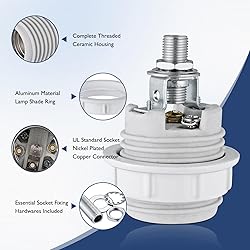 Wide Applications: Compatible with standard E26 bulbs, including LED, incandescent, and CFL bulbs. Perfect for repair projects of bathroom vanity lights, wall light fixtures, pendant lighting, floor lamps and fixture upgrades. UL Listed and porcelain Construction, ensuring a high level of safety and reliability for both residential and commercial applications.Rated for 660 watts maximum and 250 volts. Reliable Connections: Heavy-duty metal terminals provide a stable electrical connection and prevent bulb loosening. Stylish Shade Ring: White decorative aluminum ring seamlessly integrates with lamp shades and covers for a polished look. Complete Installation Kit: Includes a white shade ring, threaded pipe (1”), Locknuts and Washers, allowing for a hassle-free setup process.