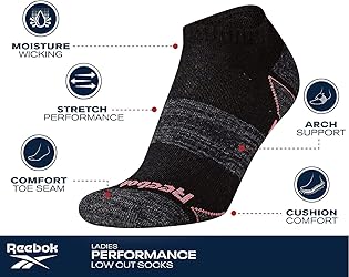 - Step into comfort and performance with Reebok Cushioned Performance socks for women, designed to support your active lifestyle from workouts to daily wear. These womens athletic socks combine style, breathability, and cushioning to keep your feet energized all day long. Made with premium fabrics, these breathable socks provide a soft, secure fit that moves with you whether you’re at the gym, running errands, or relaxing at home. The versatile design of these low cut socks women makes them the perfect match for sneakers, training shoes, or casual footwear. Engineered for performance, these workout socks women feature arch support and reinforced heel and toe areas to deliver durability where you need it most. Whether you’re looking for womens no show socks for a discreet look or simply comfortable women's socks that can handle your busiest days, these Reebok pairs are a reliable choice. With moisture-wicking technology, these no-show socks for women keep your feet cool, dry, and comfortable through every workout. The soft, cushioned footbed reduces impact while providing superior support, making them ideal for training, running, or everyday wear. Designed as low socks for women no show, they offer the perfect blend of comfort and performance while staying hidden beneath your shoes. This multi-pack ensures you always have fresh womens socks low cut on hand, giving you multiple pairs that are as stylish as they are functional. Lightweight and durable, they fit seamlessly into your collection of athletic socks, while the sleek low-rise design gives you the flexibility of low socks, socks low cut, and low rise socks all in one. Whether you need socks for women no show or versatile women’s low cut socks for every occasion, Reebok delivers performance you can trust.