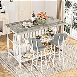 Bistro Table and Chairs Set of 2:This 3 Piece dining set features a sleek kitchen island with ample storage, including five spacious shelves. The open-sided design of the bar table allows for convenient placement of kitchen tools, enhancing practicality and style Dinner Table for 2 with Wine Glass Rack: A standout feature of this table is the built-in wine glass rack located on the right side of the tabletop, adding a functional and elegant touch to your kitchen and dining space Dining Room Table Set: Constructed from durable MDF board and iron, this set combines longevity with a modern aesthetic. The chairs, upholstered in soft PU leather and supported by metal frames, offer a perfect blend of comfort and sturdiness Kitchen Island with Stools (2 Colors): This versatile dining set serves as both a functional piece and a decorative centerpiece, effortlessly complementing a wide range of decor styles—from contemporary to traditional Dinner Table for 2 Dimensions: Compact yet practical, this island fits seamlessly into any kitchen layout, providing additional storage space for kitchen essentials. Its lightweight design and straightforward assembly make it easier to install compared to conventional kitchen islands