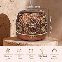 Elevate your environment with ARVIDSSON ultrasonic essential oil diffuser, designed to enhance your home's ambiance. Featuring a 500ml capacity, it offers extended misting for up to 12 hours, making it perfect for bedrooms, living rooms, or offices. Scent your home naturally with this beautiful metal essential oil diffuser. The 7-color LED lights create a peaceful ambiance, while the whisper-quiet operation ensures undisturbed relaxation. Adding a touch of tranquility to your daily routine. Crafted from BPA-free plastic, it's easy to use and perfect for any space. Pair it with our premium essential oils, to elevate your space with your favorite aromas. Automatic shut off when the water runs out, ensuring safety and convenience. Designed for both aesthetic appeal and practicality, our oil diffuser utilizes ultrasonic technology to disperse your favorite essential oils into the air, creating a serene atmosphere in any room of your home. Whether you're looking to unwind after a long day, enhance focus during work or study sessions, or simply infuse your space with delightful fragrances, our diffuser is here to elevate your experience. ARVIDSSON 500ml oil diffuser naturally scents your home and doubles as decor with its moroccan design, making it a stylish, functional, and thoughtful gift for any space. It is a great choice for anyone new to fragrance oils or looking to expand their collection.