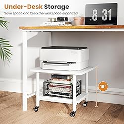 [Enhanced Organization]: Perfectly structured to hold your printer on the top and spare paper or office supplies on the bottom shelf, the 2-tier printer stand ensures everything you need is within easy reach. [Heavy-Duty Structure]: The printer table combines strength with stability, offering a reliable foundation for your valuable devices. Thanks to the robust metal structure, it can hold a remarkable weight of up to 143 lbs. [Easy Rolling Design]: Move easily around your office with the under desk printer cart, which comes with 4 universal wheels, including 2 lockable ones. It provides smooth mobility and stability when needed. [Space-Saving Storage]: Tailor-made for small offices, the 19.5"L x 16"W x 15"H mobile printer stand can fit neatly under your desk. By utilizing this compact stand, you will free up valuable desk space, making your workspace more organized. [Versatile Use]: This versatile piece can be used as a printer stand, bedside table, sofa side table, or extra tabletop. Its sleek design fits well in both homes and offices, adding convenience and usability to any room.