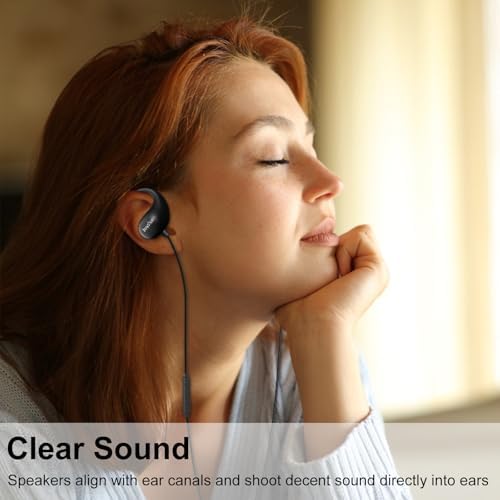 - GOOD BALANCE OF CLEAR AUDIO AND AMBIENT SOUNDS - 14mm speakers are aligned with the ear holes by the wrap around ear loops and shoot clear and loud sound into your ears, with little sound bleed to others around you. Make it feel like the stereo sound is around you while still being able to hear the surroundings with no ear fatigue. Also suitable for people who want to save hearing, since it does not blast loud music directly into your ear drums like in ear headphones. NOT FOR BASS PURPOSE.