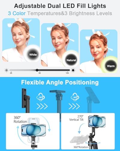 - Dimmable Fill Light&Bluetooth Remote: Dual LED lights offer Cool, Warm, and Natural tones, each with 3 brightness settings for precise control in any scene. Multifunctional Bluetooth remote lets you snap photos, record videos, and works as a scrolling remote control for TikTok and like videos with a double click. Features Type-C rechargeable with a 33ft range