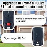 - Features: Wide Compatibility: As an upgraded version of the compatible with BFT Mitto 2 remote control, this remote control is compatible with BFT electric door receivers, compatible with BFT Clonix series receivers, compatible with BFT U-Link devices and any device that supports compatible with BFT 433.92MHz rolling code system Wide Application: The remote control is made of advanced materials to ensure long service life, and also adopts high efficiency, low power circuits for durability. Suitable for a variety of environments, including residential, commercial and industrial environments Specifications: Color: black Package includes: 6 x Dual channel remote controls Notes: Manual measurement, please allow slight errors on size. The color may exist a slight difference due to different screen displays.
