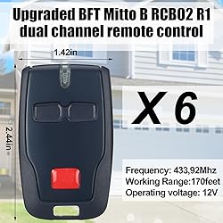Package Contents: contains 6 dual channel remote controls compatible with BFT Mitto B RCB02 R1, with cord lock and instructions; 2 channels are suitable for controlling 6 different compatible with BFT automation systems, such as garage doors, electric gates or railings, etc.; It is an ideal replacement for users with older compatible with BFT Mitto remote controls Easy to Program: use the included instruction manual to operate, and pair with the system quickly by pressing the button on the receiver; The 433.92MHz operating frequency ensures strong signal penetration with a range of up to 170 feet, and there is no need to stand nearby to ensure the garage door is closed Enhanced Security: adopts advanced 433.92MHz rolling code technology, which adjusts by sending a different signal each time, thereby preventing signal copying or interception; This pushes the anti theft capability to a higher level, suitable for replacing traditional fixed code remote controls that are easy to copy, and ensuring the security of users' access control systems Wide Compatibility: as an upgraded version of the compatible with BFT Mitto 2 remote control, this remote control is compatible with BFT electric door receivers, compatible with BFT Clonix series receivers, compatible with BFT U-Link devices and any device that supports compatible with BFT 433.92MHz rolling code system Wide Application: the remote control is made of advanced materials to ensure long service life, and also adopts high efficiency, low power circuits for durability; Suitable for a variety of environments, including residential, commercial and industrial environments