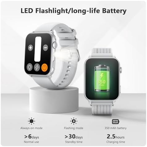 - 👍【LED Flashlight】 - The built-in high-brightness LED flashlight provides clear illumination for nighttime walks, outdoor camping, or sudden power outages with a simple press, ensuring safety and meeting emergency needs. The smartwatch can be used for up to 6 days on a 2.5-hour charge, with a standby time of approximately 30 days. The extended battery life in flashlight mode easily meets the needs of long outdoor activities.