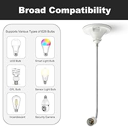 【ETL Listed】 - The light socket is ETL listed, you can trust it to be safe and reliable. Maximum power rating 660W. E26 Standard Threaded Baset. 【Parameters】 - 1 pack E26 light socket extender. Total length: 23.6 inch / 60 CM, Extended gooseneck length: 20.12 inch / 51.1 CM. Maximum temperature: 180℃, maximum wattage: 660W, Voltage Range: 0-250V. Ideal for Standard E26 E27 Light Bulb. 【High-quality Material】 - The light bulb adapter is made of flame-retardant PBT material, resistant to heat up to 180℃, corrosion-resistant, and durable. ETL certified lamp holder, safer to use. 【Easy Installation】 - Remove the existing bulb, simply screw in the extender. Sturdy socket extender with a flexible and bendable design that can be easily rotated 360 degrees in all directions to provide you with the perfect angle, this light socket extender is designed for lightweight LED bulb design. Note: Do not use heating halogen bulbs. For good curvature, bulb weight should be no more than 200 grams. 【Brighten Your Room】 - Bulb too deep inside, light blocked? Ideal extender to lower your bulbs further in recessed fixtures and extend your existing E26 screw mount/fixture, adjust light socket direction at your will. The light bulb adapters will make your bulb stand out, providing brighter illumination without the need to replace the bulb or the fixture. 【Wide Application】 - The light bulb extender is compatible with common E26 base bulbs, such as standard bulb, smart bulb, motion sensor bulb and security camera bulb. Widely used in dry locations like living room, dinning room, front porch, garage, basement, etc. 【Our Guarantee】 - All SIXZOONM light accessories have 1-year replacement service. If you have any questions about the light socket extender, please feel free to contact us, we are committed to serving you. Fast and friendly service will be provided!