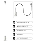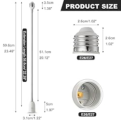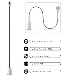 - 【Parameters】 - 1 pack E26 light socket extender. Total length: 23.6 inch / 60 CM, Extended gooseneck length: 20.12 inch / 51.1 CM. Maximum temperature: 180℃, maximum wattage: 660W, Voltage Range: 0-250V. Ideal for Standard E26 E27 Light Bulb.