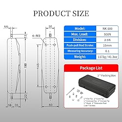 - Specification:Max. Load: 500NDivision: 2.5NPush-pull Rod Stroke: 10mmMeasuring Accuracy: 0.1Weight: 1172g / 41.3oz (approx.) Package list:1 * Dynamometer1 * Flat Tip1 * Cone Tip1 * Concave Tip1 * Convex Tip1 * Hook1 * Extension Rod1 set * Screws1 * Packing Box