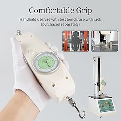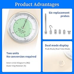 Multi-precision Force Measurement Tool:This analogue force gauge offers a choice of precise force readings of 500N with a clear dial gauge, making the push pull tester ideal for tension and compression tests in labs, workshops, and production lines. The mechanical force meter eliminates the need for batteries, ensuring reliable performance in any environments. Ergonomic Handheld and Bench-Mount Design:Designed for versatility, pointer indication, easy to read, high testing accuracy, the force gauge can be used as a portable handheld device with compact size and easy operation or mounted on workbenches for stable operation, clamps or fixtures can be attached for repetitive testing tasks. (Clamps or racks are not included and can be purchased separately if required.) Simple Design and Easy to Use:This mechanical force measuring meter instrument tester have two units without conversion, the inner ring is kilograms and the outer ring is newtons, which is convenient for visual display of values. The push pull dynamometer have five kinds of replacement probes to meet your different needs in different scenarios. The dynamometer have dual-mode display, switching between peak mode and real-time mode with one touch of a button. Wide-Range Applications Across Industries:The force measuring tool is suitable for push and pull load test, insertion and extraction force test, destructive test of various products. Accurate dial reading pointer can serve many fields such as electronics, textile, hardware, light industry and so on. The force gauge's 50N-500N range covers everything from delicate pen springs to heavy industrial components. Care and Maintenance:1.Do not apply more load than the large load of the Push-Pull Meter to avoid damage to the instrument. 2.Please keep and store the instrument properly according to the regulations, and avoid storing or using the Push-Pull Meter in places with low temperature, low humidity or high temperature, high humidity and corrosive medium, so as not to damage the instrument.