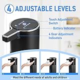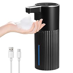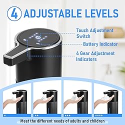 【Automatic Soap Dispenser】Built-in upgraded infrared sensor, when you place your hand within 0-2.7 inches below the sensor, the soap dispenser accurately senses and dispenses soap to make your washing more hygienic and safer, and the soap dispenser's no-drip spout minimizes clogging. 【4 Levels of Adjustable Soap Output】This dishwasher soap dispenser has 4 different soap output settings, you just need to adjust 4 levels of lather volume by one-touch operation, the LCD display shows the real-time battery life and gear settings, easy to use and dispense the soap quickly, no need to worry about the soap volume is too little or too much, which can't satisfy your needs or waste the soap 【Stylish, Waterproof and Leak-proof Design】 The Automatic Foam Soap Dispenser is made of matte black, high quality plastic with chrome-plated edges and features a classic vertical design for a clean look and easy cleaning. The soap dispenser also features leak-proof and IPX5 waterproof technology that prevents soap or water from corroding the circuit board. The non-slip base and high sealing rubber ring enhance its durability and water resistance. 【Large Capacity and Universal Soap Compatibility】 The automatic soap dispenser features a wide opening design, 400 ml/13.52 oz. tank to avoid frequent soap additions, and is designed with a visual window to monitor the amount of soap. Suitable for foam soap (for direct use) or liquid/gel soap (diluted with water at a 1:3 ratio) 【Long-lasting Battery, Flexible Installation】It can be fully charged in 2-3 hours on a single charge and lasts for more than 90 days (Gear 1: 10 times/day), no need to recharge it frequently, plus we included 2 non-marking stickers, The automatic soap dispenser can be mounted on the wall or placed on the countertop, which is very suitable for kitchens, bathrooms or high-traffic areas