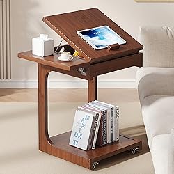 [Versatile Tilt-able Tabletop]: The Tabletop of C-Shaped end table adjustable in five angled positions to find your ideal angle for work, drawing, reading or relaxing. The stop bar keeps items secure when angled, ensuring a comfortable and practical experience [C-Shaped Side Table with Stroage Space]: This side table has a large main top plus a small drop-leaf side panel that pops up when you need extra space. Storage compartments underneath the desktop for books, remotes, glasses, and the weighted base keeps it steady [360° Lockable Caster C-Shaped Table]: The bottom of the rolling side table is equipped with 360° silent universal wheels, making it easy to move and pushed under the sofa or bed, locking the table in place when needed. The compact C-shaped table structure, compared to traditional end table, it can saving 40% of the floor space [Applicable to Various Scenarios]: Whether it is used as a sofa side, nightstand, tv dinner tray, or as an office desk during work. And this end table can blend well in living room, bedroom, home office, apartment. Meanwhile, this C-shaped coffee table is an ideal choice for families with children, elderly, pets [Solid and Stable Construction]: Crafted with high-grade bamboo, this C-table is built to last. Exquisite rounded corners and strong load-bearing capacity, safe and durable, Casters with brakes ensure stability