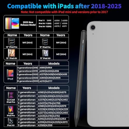 - Compatiblity for ipad Pencil: This stylus pen for iPad compatible for Apple iPad 2018 - 2025 released models, the iPad pen can work for iPad a16/11th/10th/9th/8th/7th/6th gen, for iPad Air 3rd/4th/5th/M3/M2, for iPad Pro 11 Inch 1st/2nd/3rd/4th Gen and iPad Pro 12.9 Inch 3rd/4th/5th/6th Gen. Not Compatible for iPad and any Other Models, for iPhone, for Android or for Microsoft devices