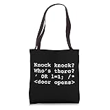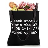 Funny Hacker design for Cyber Security specialists, SQL Programmers, DBA, Web developers, and Hackers. Funny Hacker Injection Knock knock joke design for Network programmer, computer security professional, web developer, backend coder, and database programmer. 16” x 16” bag with two 14” long and 1” wide black cotton webbing strap handles. Made of a lightweight, spun polyester canvas-like fabric. All seams and stress points are double-stitched for durability, and the reinforced bottom flattens to fit more items and hold larger objects. Spot clean/dry clean only.
