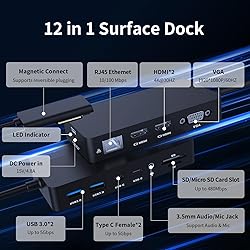 - New 12-in-1 Surface Dock - Unleash the Full Potential of SurfaceDesigned specifically for the Surface family, this versatile 12-in-1 docking station combines powerful performance with a convenient experience. Whether you're working on business, designing creative projects, or enjoying home entertainment, it can easily upgrade your work and lifestyle.Plug and Play, Fully CompatibleNo driver installation required, plug & play. Compatible with a wide range of Surface devices, suitable for various work, learning, and creative scenariosSurface Pro 11/10/9/8/X/7+/7/6/5/4/3Surface Laptop 7/6/5/4/3/2/1Surface Laptop Studio 2/1Surface Go 4/3/2/1Surface Laptop GoSurface Book12 versatile ports for endless connectivityInstantly transform your Surface into a powerful workstation, easily connecting a variety of devices:USB-A 3.0 x2 & USB-C x2: Connect external keyboards, mice, USB flash drives, and more, with up to 5Gbps high-speed data transferRJ45 Gigabit Ethernet: Stable, low-latency, no more wireless lagSD/TF card slot: Supports up to 2TB of storage, allowing for instant photo and video import3.5mm audio jack: Compatible with 3/4-pin headphones for both work and playHDMI x2 and VGA outputs: Support triple displaysDC Power: Up to 72W fast chargingMulti-screen collaborationIt allows up to three screens to be extended simultaneously, meeting professional needs such as multitasking, presentations, and image editing. Easily expand or mirror different content.4K HDMI: up to 3840x2160@30Hz crisp image qualityVGA port: up to 1080P@60Hz stable outputNote: To connect three external monitors, turn off the Surface's built-in screen.72W Power for Long-Lasting Battery LifeEquipped with a DC 15V/4.8A input, this Surface Dock outperforms the original 45W charger with up to 72W fast charging. Keep your Surface powered all day with improved speed and efficiency. RJ45 Ethernet port Ensures a stable, low-latency network connection — perfect for HD streaming, video conferencing, and large file transfers.New Upgrade, Supports Forward and Reverse Insertion3.5mm audio and microphone jackThe Surface Dock supports simultaneous audio and video streaming, and Surface Dock lets you connect speakers and enjoy high-quality sound.Fast SD/TF Card ReaderThe Surface Card Reader easily expands your SD/TF slot and reads and writes to two cards simultaneously, saving you the hassle of constant plugging and unplugging.The Surface Dock supports SDXC, SDHC, SD, MMC, RS-MMC, Micro SD, TF, Micro SDXC, Micro SDHC, and UHS-I memory cards.Supports SD/Micro SD cards up to 2TB.Surface Magnetic PortOur Surface Pro docking station features Surface Connect technology, delivering smooth, high-speed video, audio, and data transfers while simultaneously charging your device via the Surface Magnetic Connector. A white LED light above the connector illuminates when properly connected.SuperSpeed Data TransferIt supports SuperSpeed data transfers up to 5Gbps, 10x faster than USB 2.0, ensuring all your devices connect quickly and efficiently.This Surface Dock features two USB-A ports and two USB-C ports for seamless connectivity to a wide range of devices, including USB flash drives, hard drives, keyboards, mice, printers, USB flash drives, MP3 players, and more. All ports work simultaneously, bringing unparalleled convenience and versatility to your workspace.