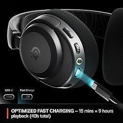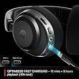 PRESETS FOR CoD, FORTNITE, AND MORE – Control your audio using the mobile app to hear footsteps better in game. Unlock total audio control with 200+ game presets in the Arctis Companion. OPTIMIZED FAST CHARGE — Get back into action in a flash with fast charging: 15 minutes equals up to 9 hours playback. A full charge lasts up to 40 hours COMFORT AND DURABILITY — At only 260G with a stretchy headband for comfort and multiple adjustment points headset headache is a thing of the past. The dual-hinge design adds rugged durability. NEODYMIUM MAGNETIC DRIVERS — Custom-designed high-fidelity audio drivers create an ultra-detailed soundscape of clear highs, pinpoint mids, and deep bass USB-C PLUG & PLAY — Easily swap between PC, PlayStation, Switch, handhelds, phones or tablets with a multi-platform USB-C Dongle
