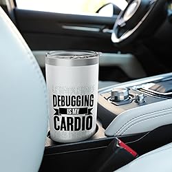 Debugging Is My Cardio This design with a debugging phrase is made for coders and programmers. Perfect present for anyone who loves the different programming languages. Dual wall insulated: keeps beverages hot or cold Stainless Steel, BPA Free Leak proof lid with clear slider